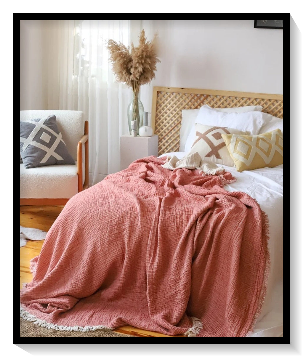 Päiväpeite laadukasta nelja-kerroksisesta musliinia, laadukas turkkilainen kangas on kivipesty miellyttävän pehmeäksi ja neutraalit värit sopivat hyvin yhteen monenlaisen sisustuksen kanssa.